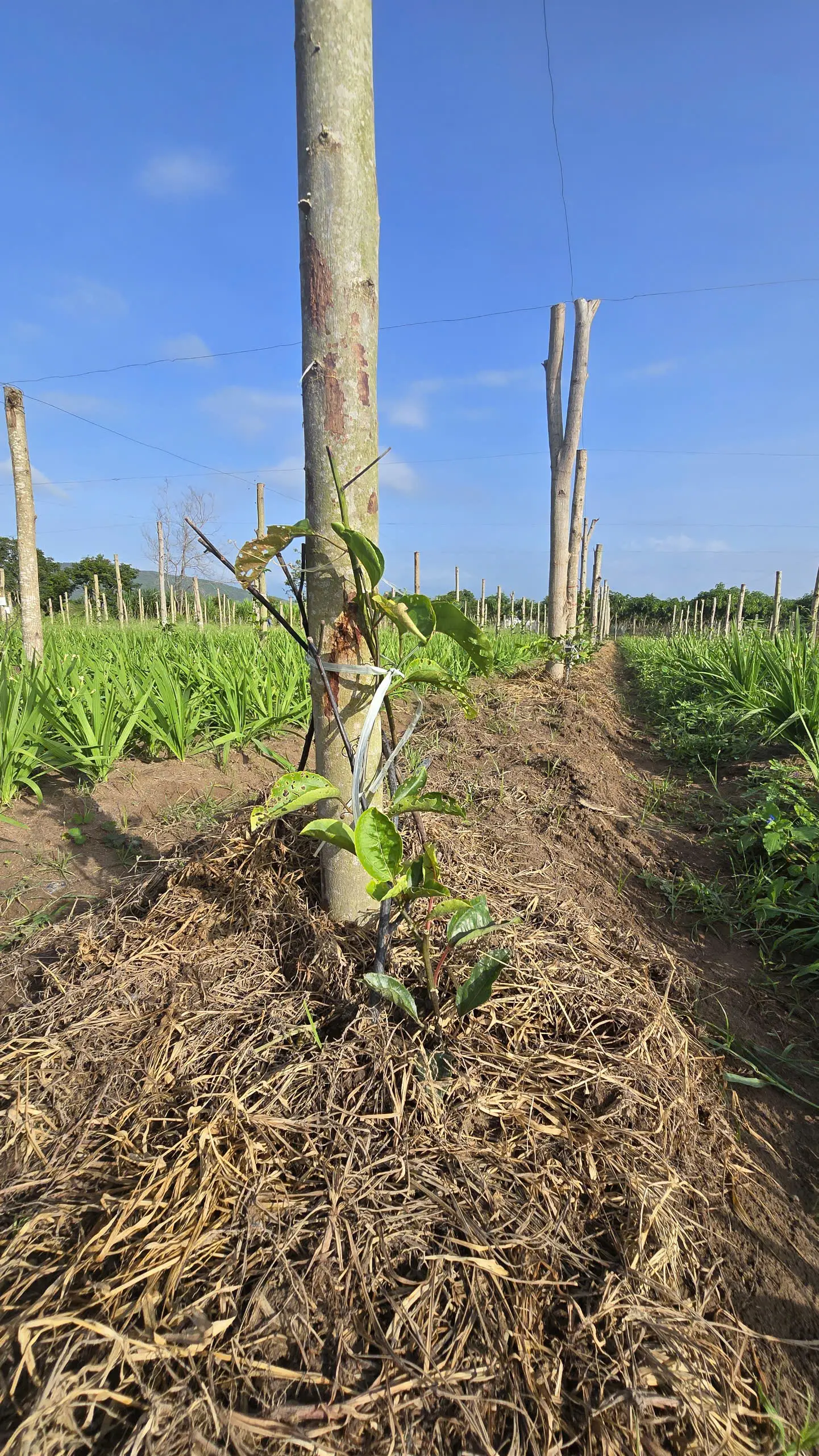 Dọn sạch tàn dư cành lá sâu bệnh dưới các gốc Chanh leo, đào rãnh xung quanh gốc Chanh leo và bắt đầu bón phân bò và rơm gần với gốc cây Chanh leo, giúp tái tạo lại đất và cắt bỏ những phần rễ bị hư hại. Vệ sinh vườn sạch sẽ bằng việc cắt cỏ giữa các hàng Chanh leo.